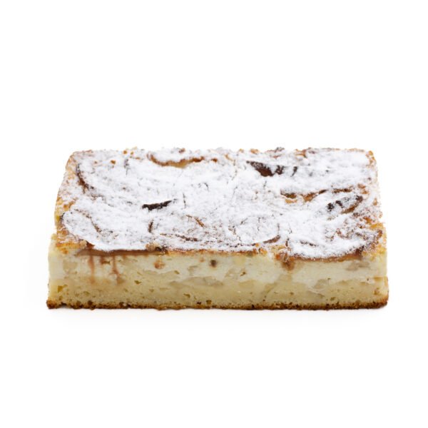 Apples 35%, CURD for baking (pasteurized skimmed MILK; stabilizers: modified starch, fibers; rennet, bacterial cultures), cake and muffin mix (sugar, WHEAT flour, modified corn starch, rapeseed oil, WHEAT whey (contains MILK), leavening agents: E451, E500, emulsifiers: E477, E481, WHEAT gluten, salt, flavorings, EGG powder), sugar, sour cream 30% (CREAM, starter culture), EGG mass, rapeseed oil, WHEAT flour, vanilla sugar (sugar, flavoring – vanillin), icing sugar, cinnamon.