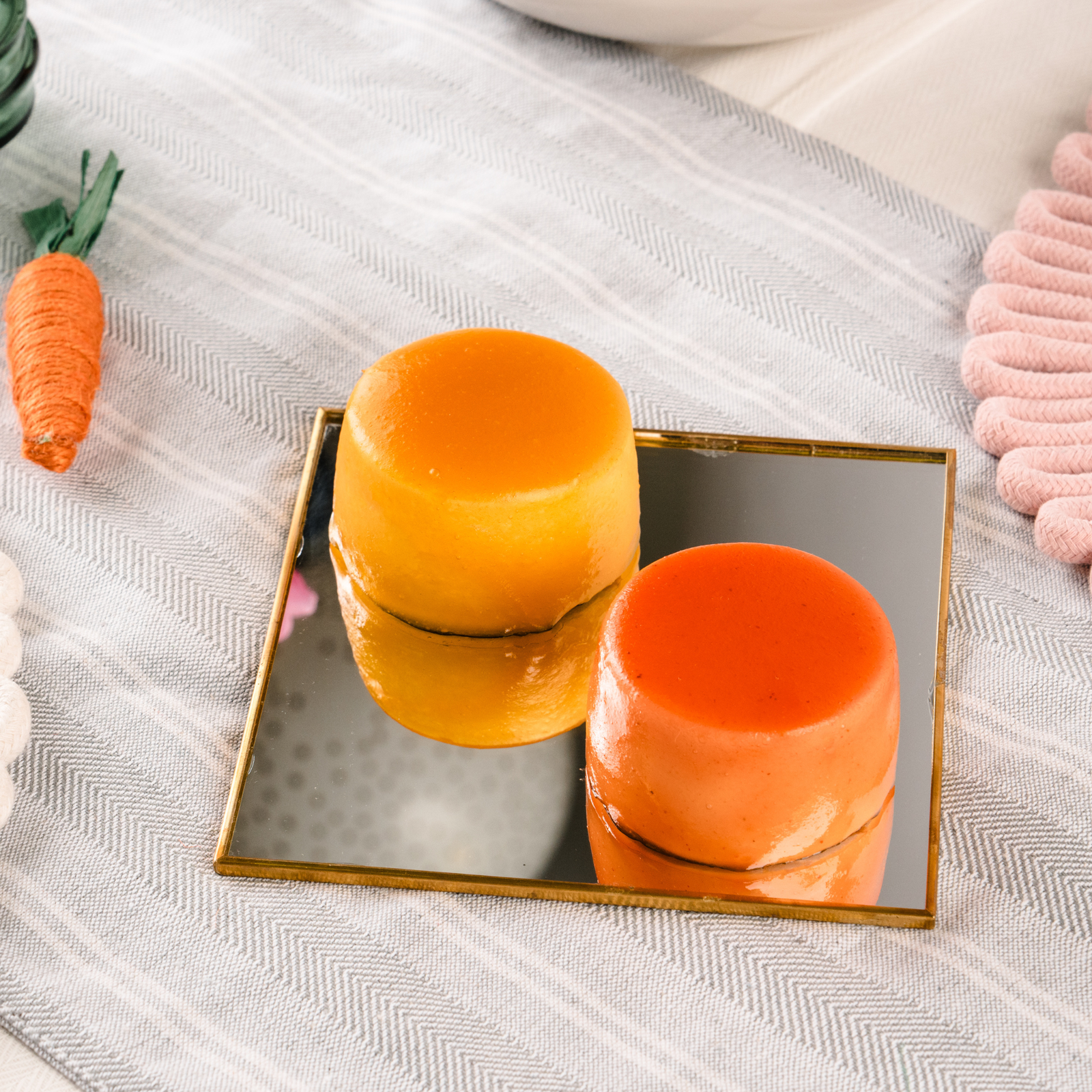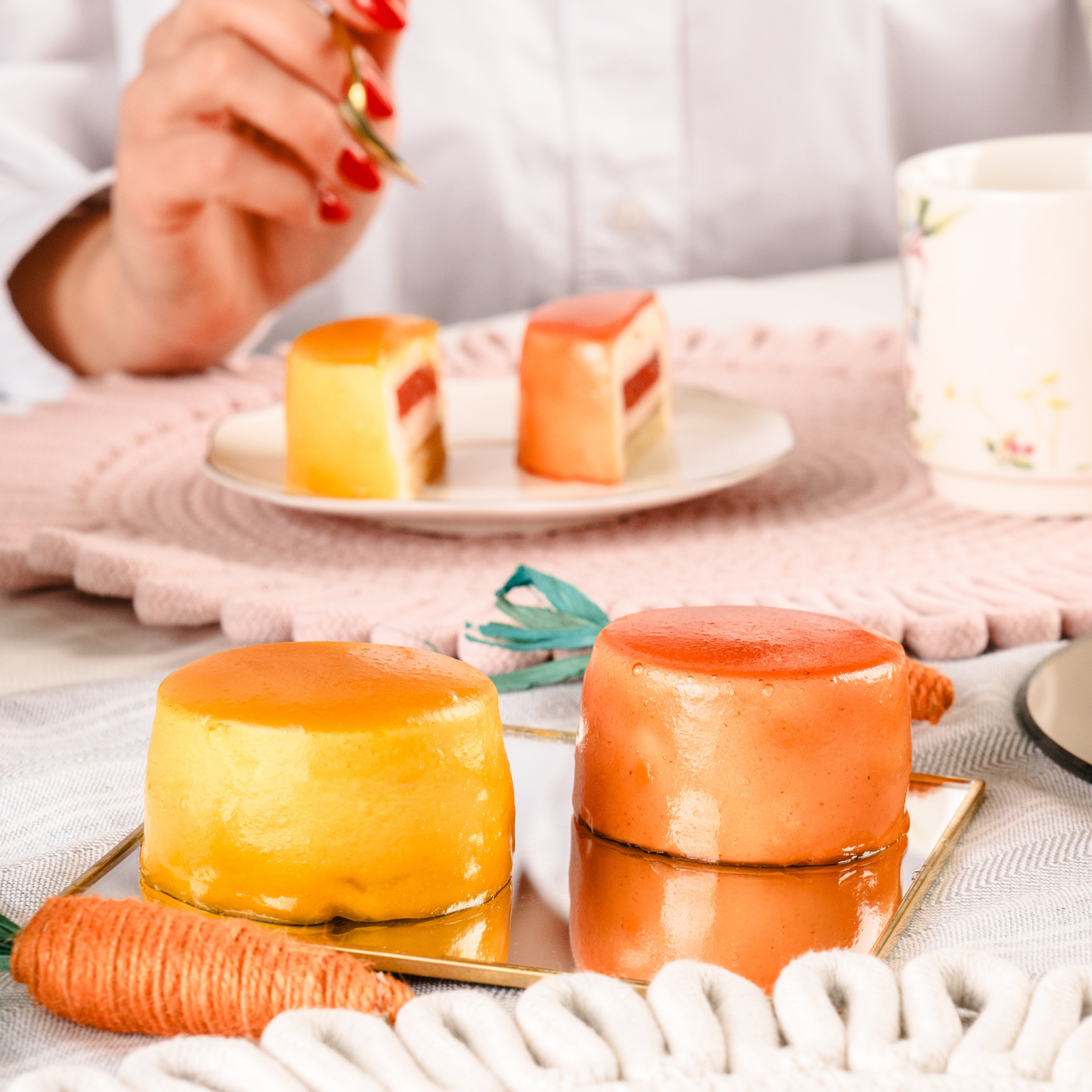 Assorted pastries – an exclusive selection of mousse desserts combining fresh citrus and tropical flavours. The blood orange pastry stands out with its light tartness and fruity freshness, complemented by strawberry notes and delicate mascarpone cream.