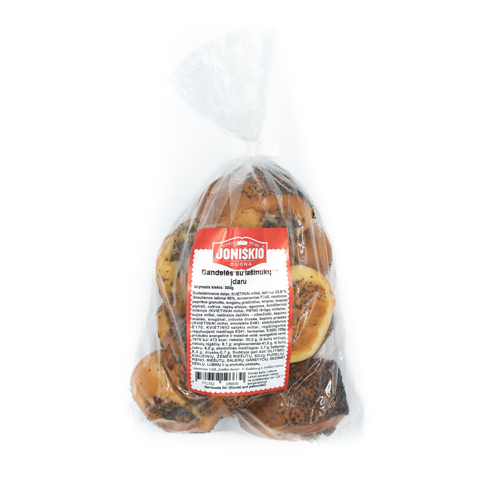 WHEAT flour, bacon 20.9% (pork fat 95%, preservative E250, red pepper granules, onion slices, caraway seeds, allspice), sugar, rapeseed oil, poppy seeds, confectionery mix (WHEAT flour, MILK whey powder, soy flour, natural coloring – turmeric), baking yeast, onions, iodized salt, baking additive (WHEAT flour, emulsifier E481, stabilizer E170, WHEAT malt flour, acidity regulator E341, enzymes, E300).