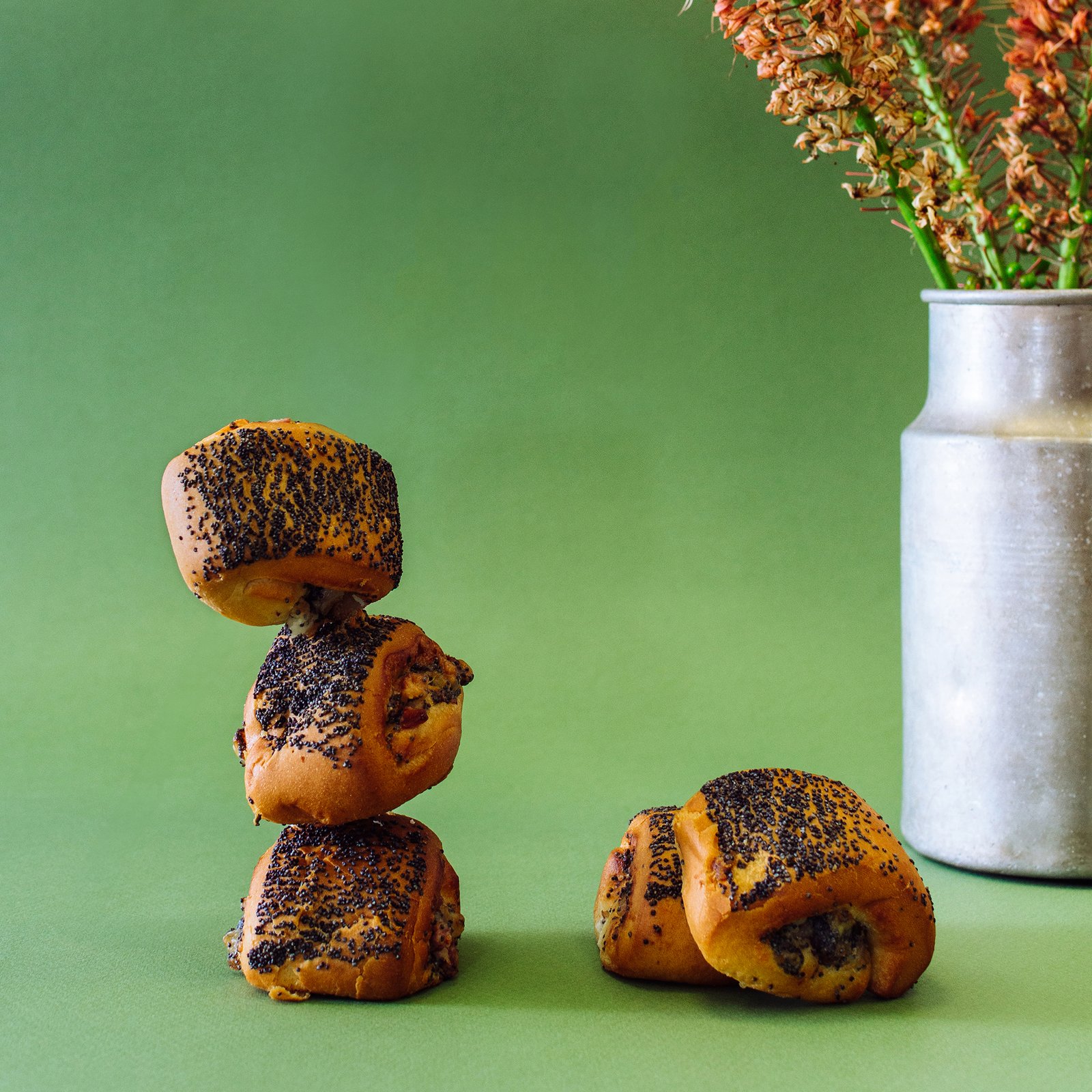 Small rolls born from careful hands, carrying the warmth and simplicity of home. Each one holds the promise of a satisfying bite. Inside, the bacon filling brings a sense of comfort and strength, as if drawn from old baking traditions. A layer of poppy seeds covers the top, a reminder of patience and craftsmanship. Every bite feels like a brief pause in the day — a moment for simple, honest food.