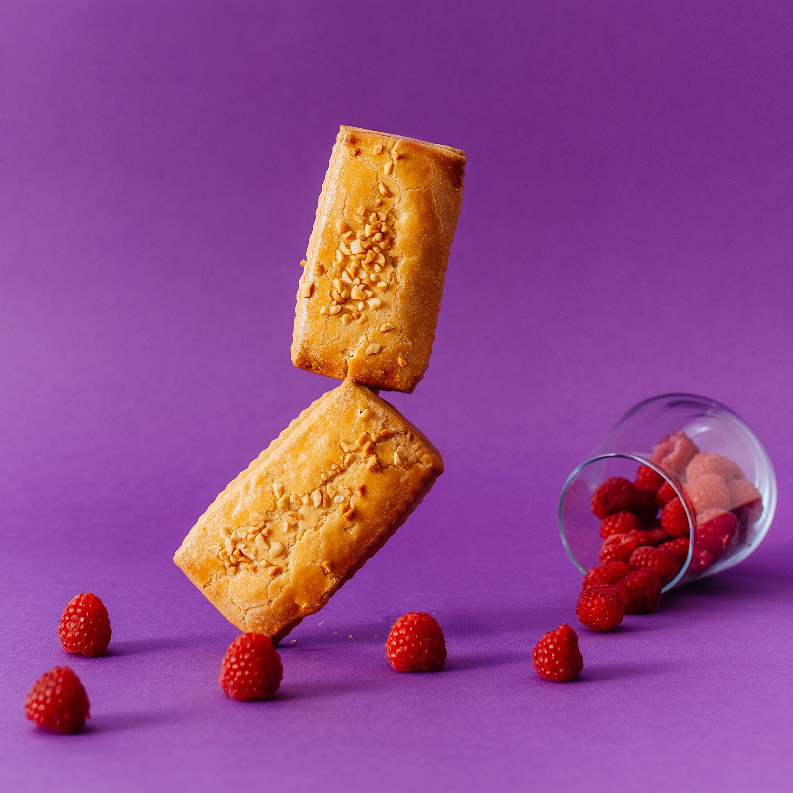 WHEAT flour, raspberry filling (sugar, raspberries (20%), glucose-fructose syrup, water, thickener E440, ascorbic acid E300. Acidity regulators: (E331, E333, preservative E202), sugar, margarine (vegetable oils: palm, rapeseed, emulsifier E471, salt, acidity regulator E330, flavouring, colouring E160b), BUTTER.