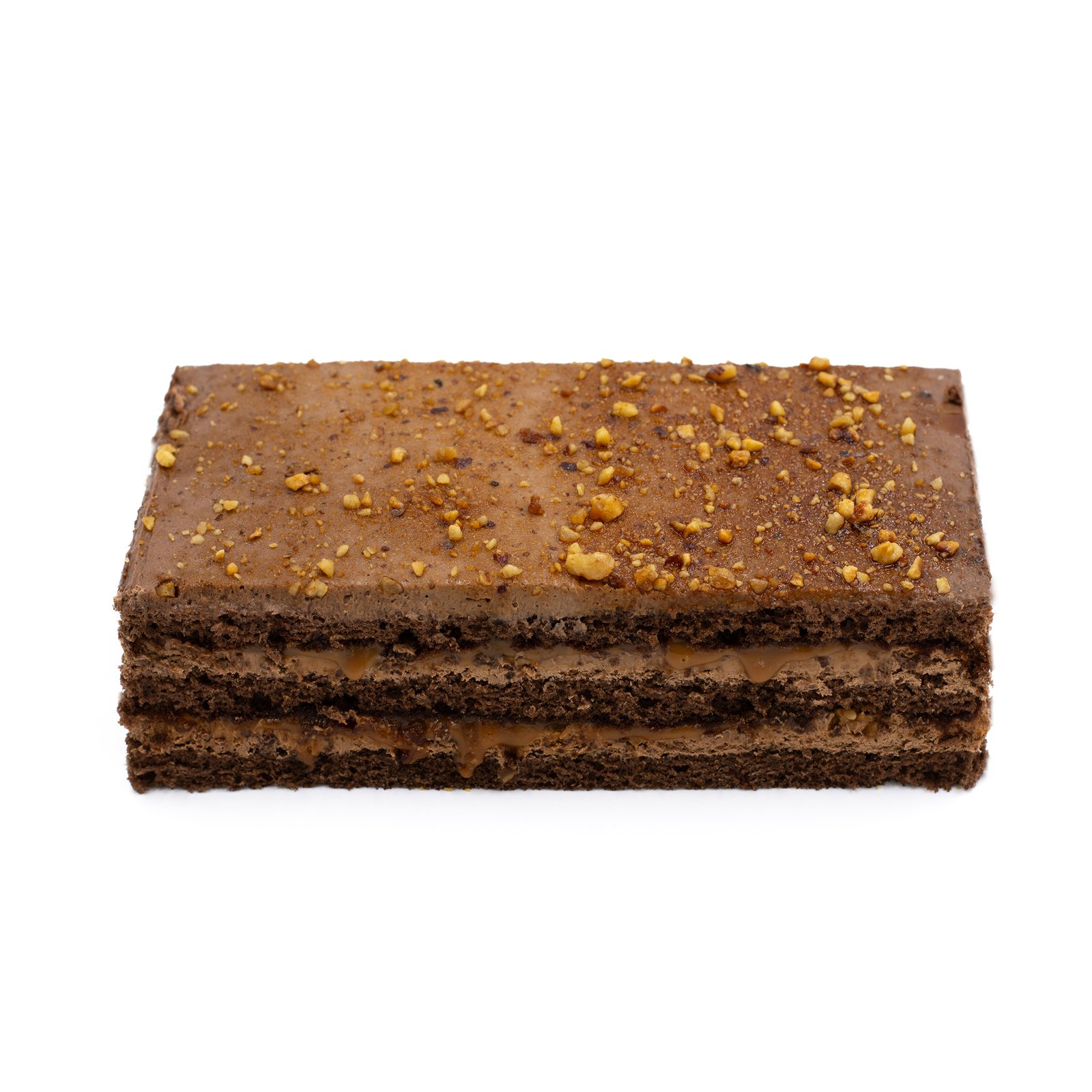 Grillage layered cake – a dark brown, multi-layered dessert with chocolate cream and a topping of crushed nuts. It blends the richness of cocoa, the roasted flavor of hazelnuts, and the smoothness of cream. Each bite offers a delicate harmony of sweetness and caramel notes that leaves a warm, comforting impression.